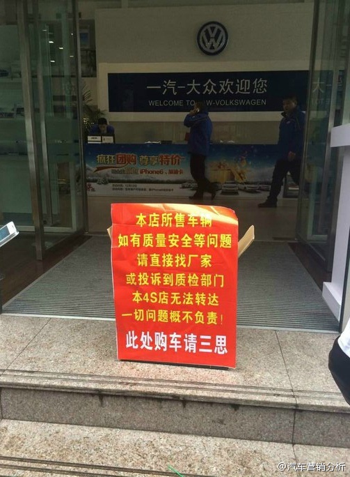 4S店是一种以“四位一体”为核心的汽车特许经营模式,包括整车销售(Sale)、零配件(Sparepart)、售后服务(Service)、信息反馈(Survey)。然而这家经销商表示:本4S店无法传达一切问题概不负责!