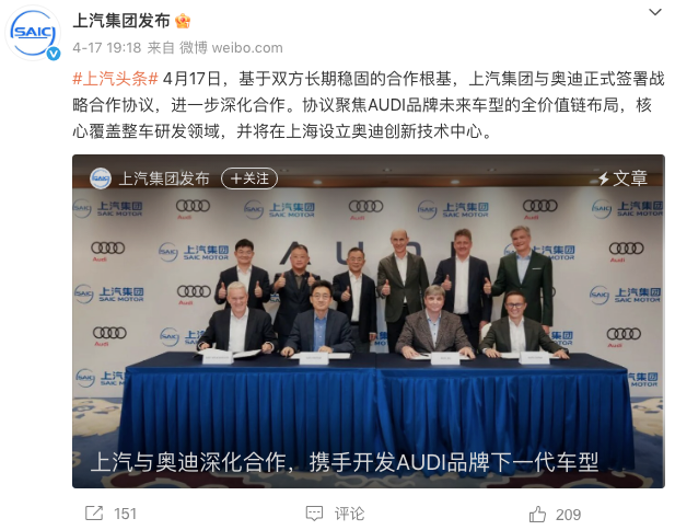 全新合作!奥迪上汽官宣