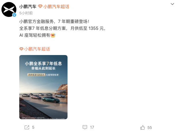 月供1355元!小鹏汽车官宣全系享7年低息