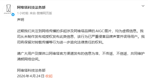 虚假信息!阿维塔科技法务部回应网传AIGC图片