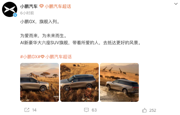 2月5日,小鹏汽车对外发布全新旗舰SUV车型官图,并将新车定名为——小鹏GX。小鹏汽车表示,新车基于全新的SEPA 3.0物理AI整车架构打造,定位AI新豪华大六座SUV旗舰,搭载线控转向和后轮转向的