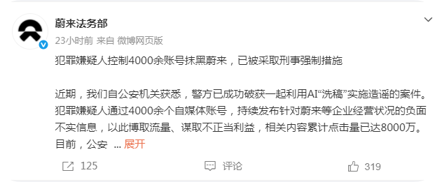 被刑拘!蔚来法务部:嫌犯控制4000余账号抹黑蔚来