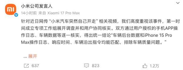 排除车辆质量问题!官方回应小米汽车突然自己开走