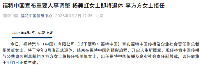 人事变动!福特中国官宣最新任命