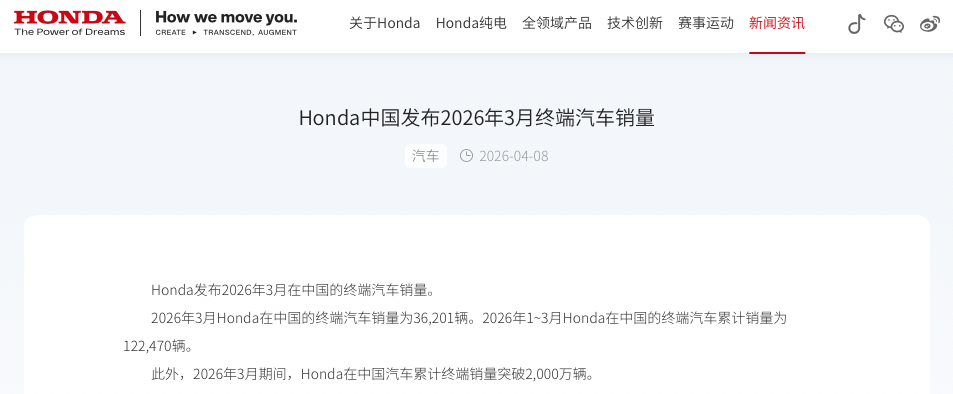 本田在华一季度销量公布!