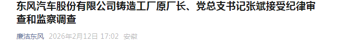 2月12日,据中央纪委国家监委驻东风汽车集团有限公司纪检监察组、湖北省咸宁市纪委监委消息:东风汽车股份有限公司铸造工厂原厂长、党总支书记张斌涉嫌严重违纪违法,目前正接受东风汽车股份有限公司纪委和湖北省