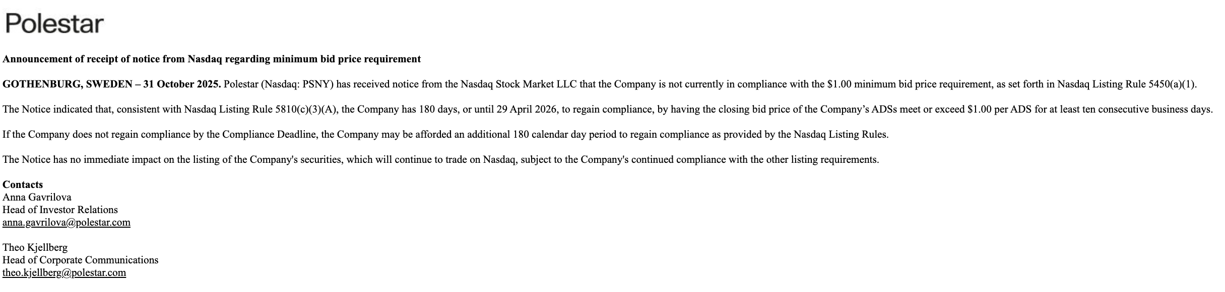 连续低于1美元!极星汽车收到纳斯达克退市警示函