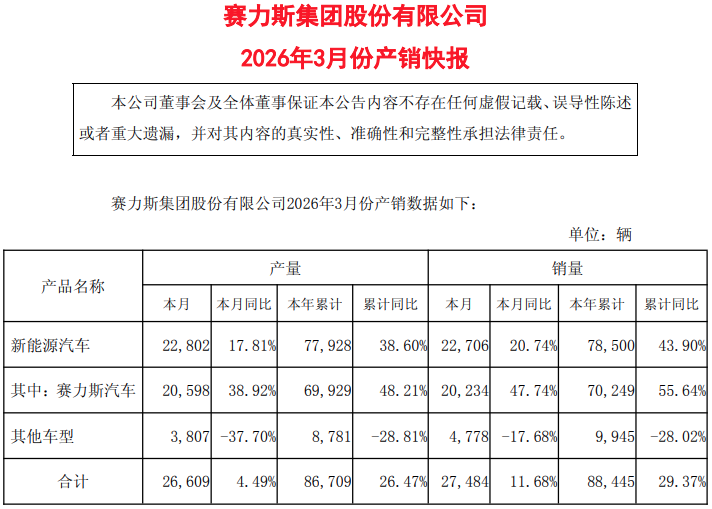 同比增长20.74%!赛力斯3月销量发布