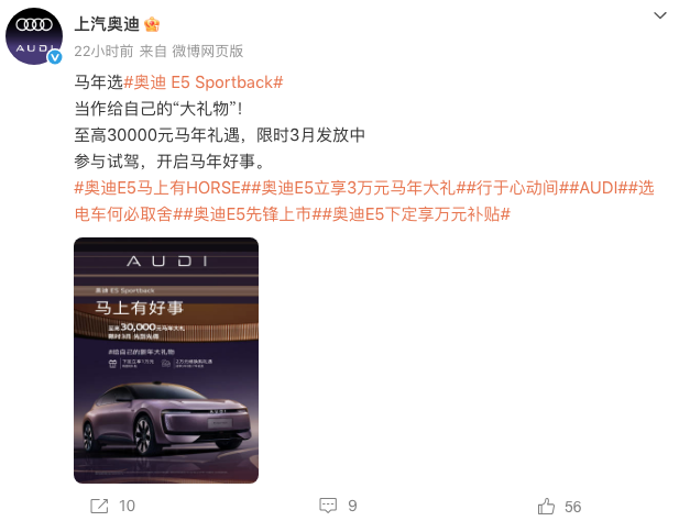 限时3万大礼包!上汽奥迪E5 Sportback限时20.59万起购