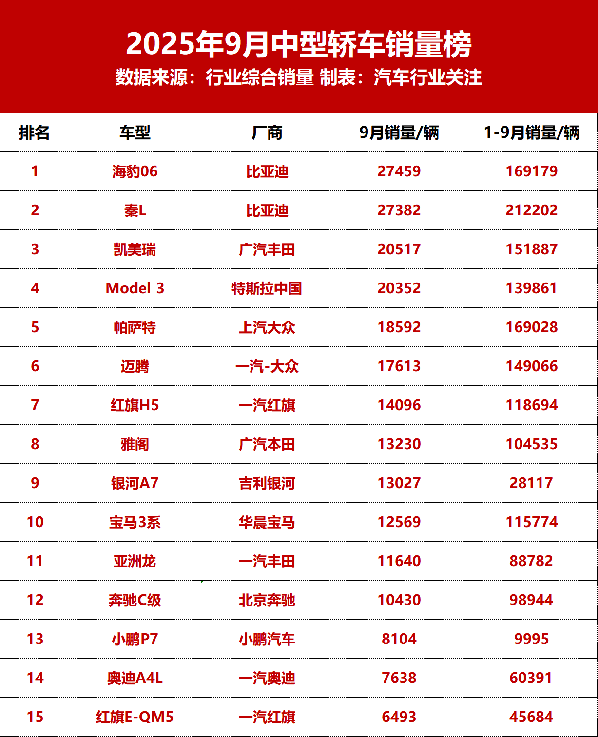 小米SU7连续9月第一!9月中大型车销量榜出炉