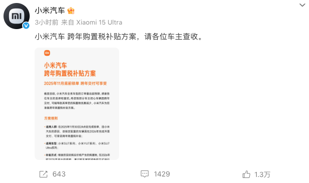 最高不超1.5万元!小米汽车发布跨年购置税补贴