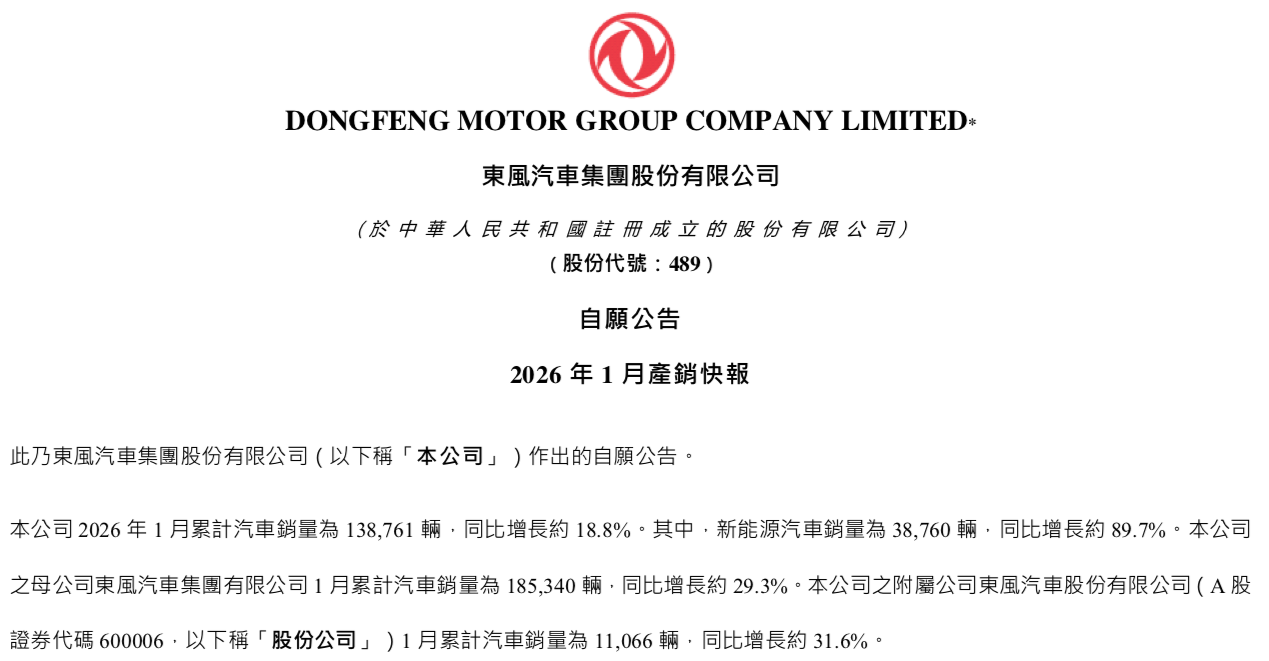 同比增长18.8%!东风汽车集团1月销量发布