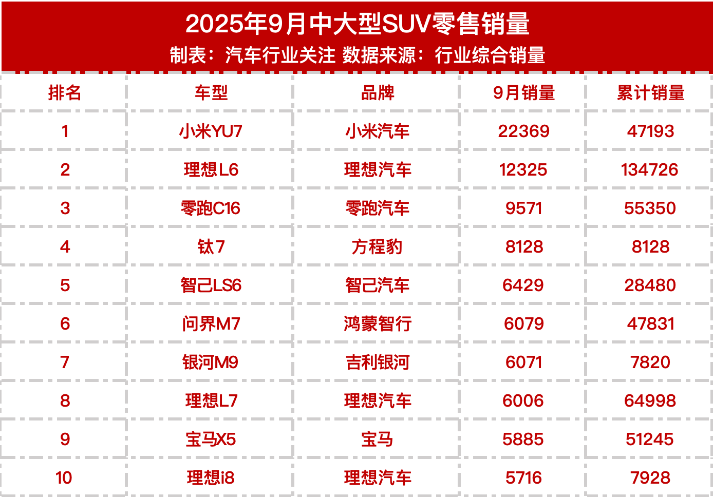 小米YU7断崖领先!9月中大型SUV销量榜单出炉