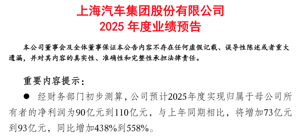 上汽集团公告!净利润同比预增438%到558%