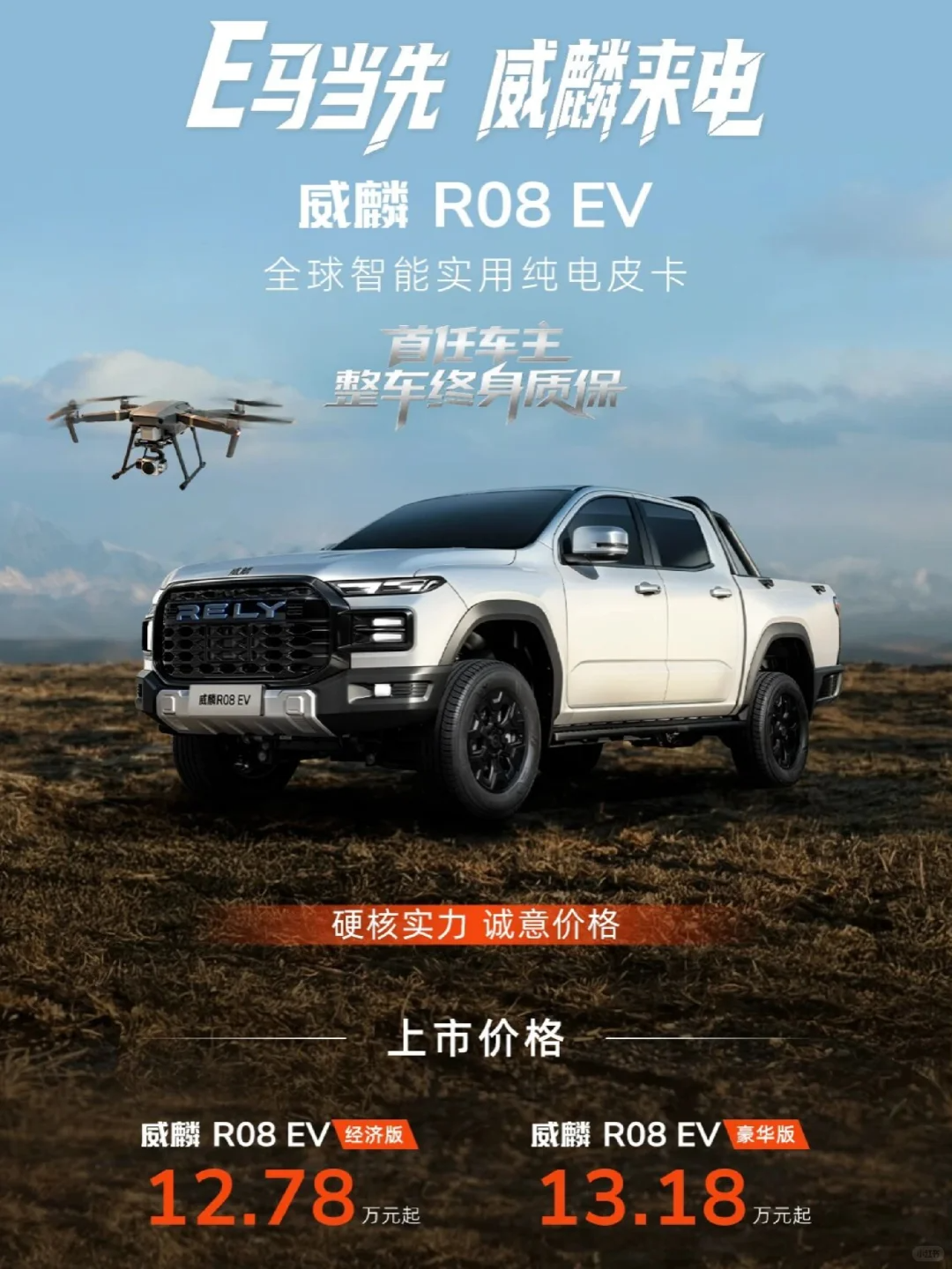 1月27日,奇瑞汽车旗下全新皮卡车型——威麟R08 EV迎来正式上市,新车分为经济版和豪华版共推出6款车型,售价区间为12.78-15.88万元。据了解,RELY威麟是奇瑞汽车在2025年4月发布的全