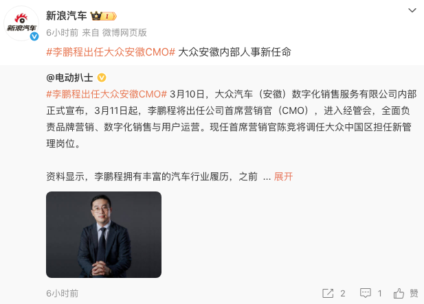 曝李鹏程出任大众安徽CMO!