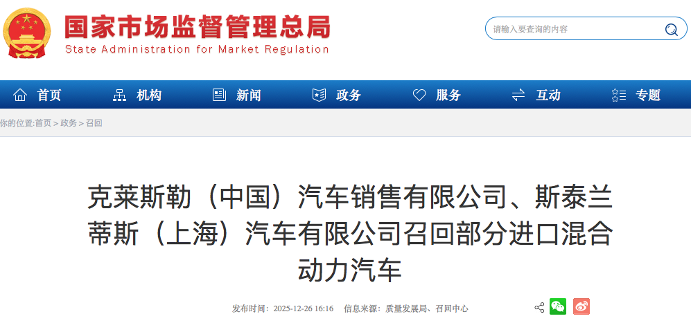 12月26日,国家市场监督管理总局发布最新召回公告。公告显示,克莱斯勒(中国)汽车销售有限公司自即日起,召回2021年1月19日至2023年9月11日期间生产的部分进口2.0T 4xe Sahara四
