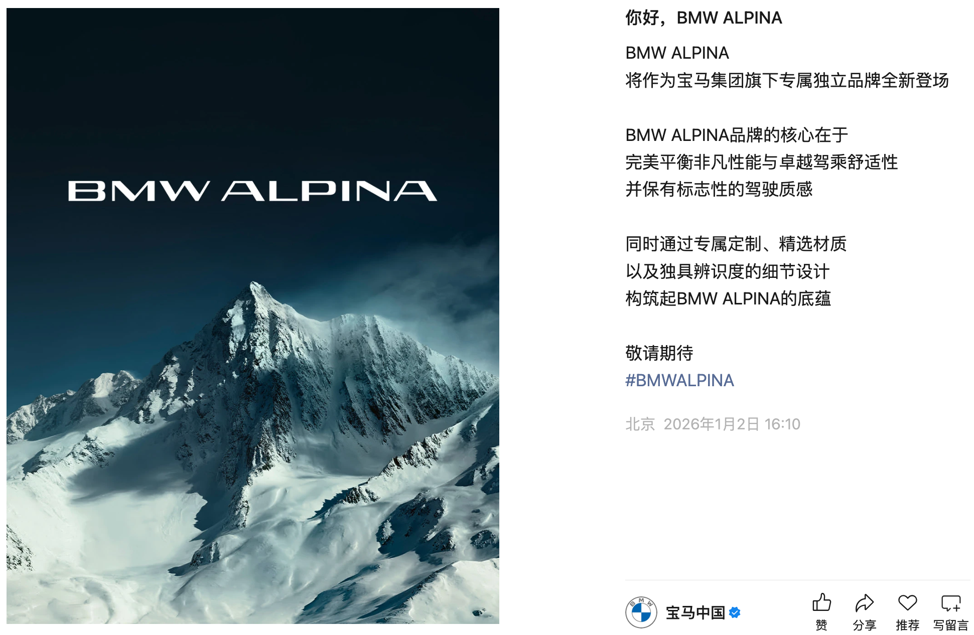 1月2日,宝马中国宣布,BMW ALPINA将作为宝马集团旗下专属独立品牌全新登场。据介绍,其核心在于完美平衡非凡性能与卓越驾乘舒适性,并保有“标志性”的驾驶质感,同时通过专属定制、精选材质,以及独具