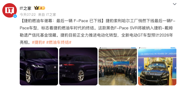 据多家媒体报道,英国豪华汽车制造商捷豹品牌最后一辆燃油车型——F-PACE SVR已在12月19日位于英国索利赫尔工厂下线,标志F-PACE SVR车型正式谢幕。需注意的是,该车也是捷豹生产的最后一款