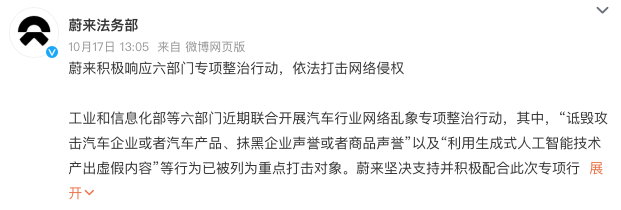 攻击诋毁蔚来!某网络账号持有人一审败诉