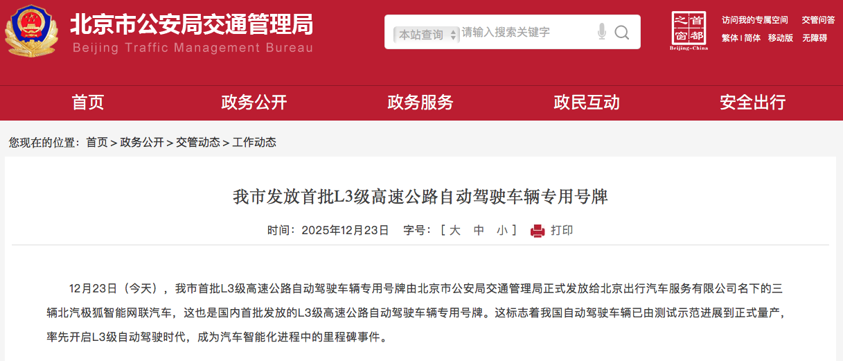 北京发放首批L3高速专用号牌!三辆北汽极狐上牌