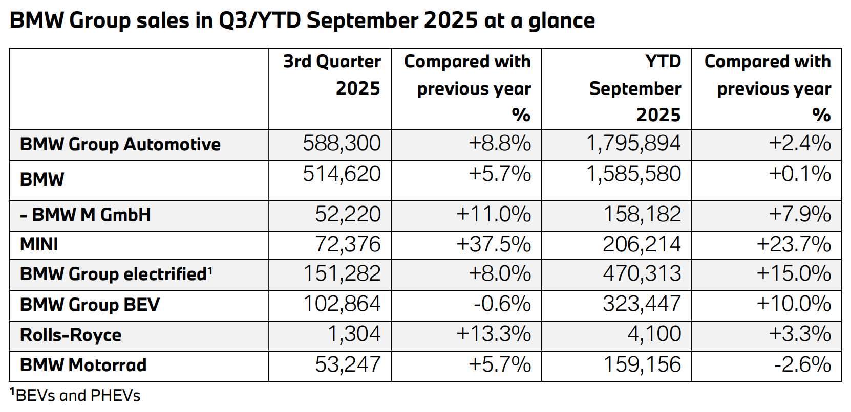 当地时间10月10日,宝马集团发布最新销量报告显示,宝马集团第三季度全球销量为588,300辆,同比增长8.8%,前三季度累计销量1,795,894辆,同比增长2.4%。第三季度宝马电动车销量151,