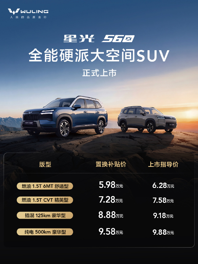 1月15日,上汽通用五菱旗下五菱星光560正式上市,新车共推出4款车型,售价分别为6.28-9.88万元,置换补贴价5.98-9.58万元。作为参考,新车首发权益价为5.98-9.88万元,原首发抢订
