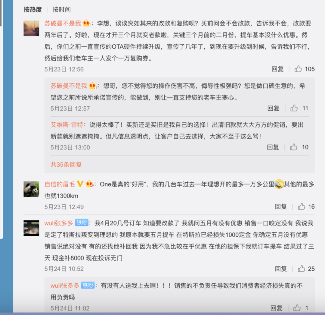 而在现在这个新一轮的争议事情上,一方面,这些车主们正在试图通过法律渠道去维权,这就需要证明理想汽车在销售行为当中存在故意隐瞒,前线的销售大多会以不知情为由来解释前期对消费者的误导,至于法院会不会认定直营的理想汽车销售的说法,是否能等同于理想汽车的立场,则决定了维权是否能成功。但很显然,理想的高层对产品的发布时间必然是非常清楚的。