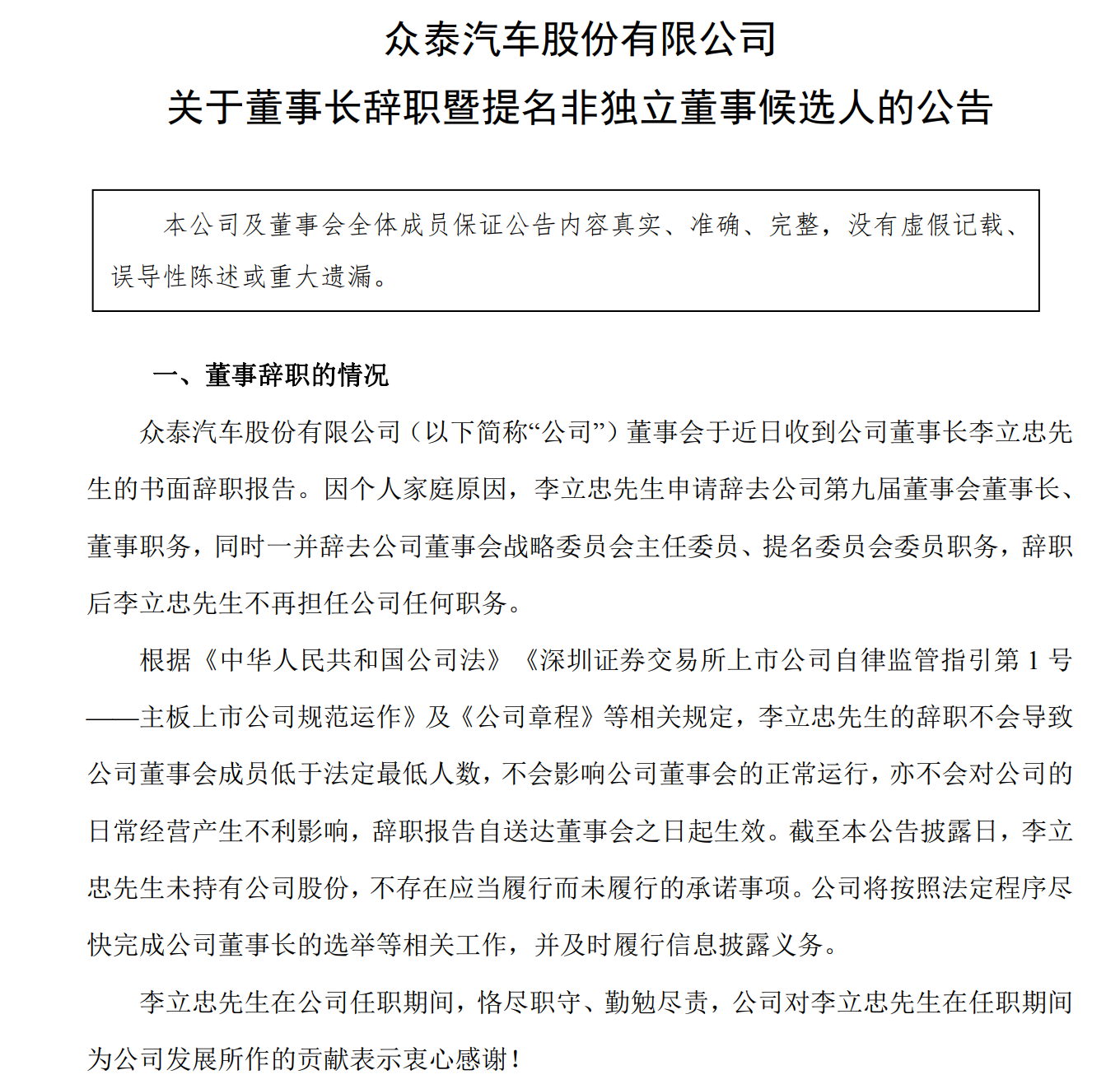 12月29日,众泰汽车发布公告称,公司董事长李立忠因个人家庭原因申请辞去董事长、董事职务,同时辞去董事会战略委员会主任委员、提名委员会委员职务。李立忠的辞职不影响公司董事会正常运行和公司日常经营。公司