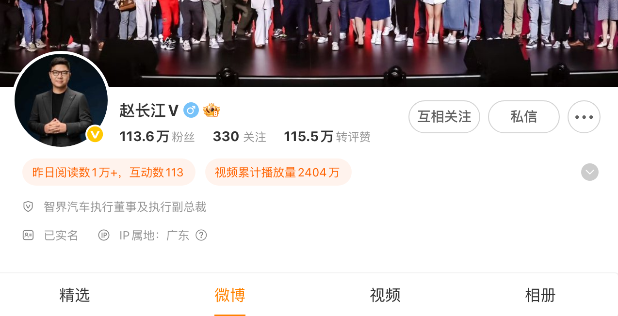 1月13日,赵长江发布长文官宣加入鸿蒙智行智界汽车。根据微博认证信息,赵长江出任智界汽车执行董事及执行副总裁。赵长江首先感谢比亚迪,称在比亚迪的宝贵经历,让自己深谙坚守用户价值、技术创新、推动产业进阶