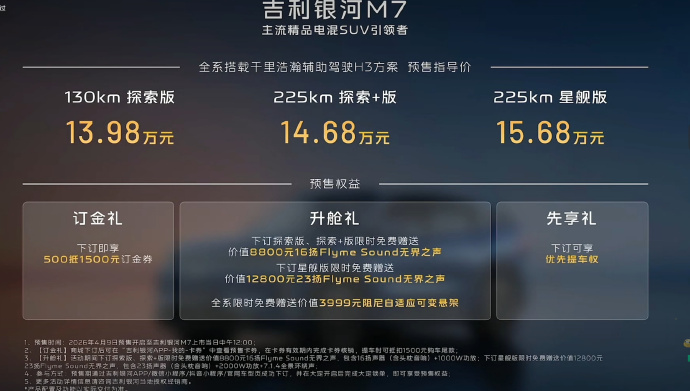 4月9 日,吉利银河M7开启预售,预售价 13.98 万元起。据了解,新车定位紧凑型 SUV,共提供三款配置车型。其中,130KM 探索版售价 13.98 万元,225KM 探索 + 版售价 14.6