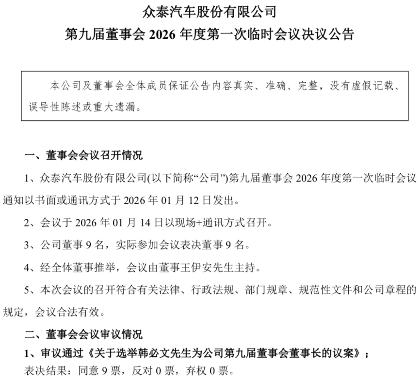 1月14日,众泰汽车股份有限公司(下称“众泰汽车”)发布《关于选举董事长及补选董事会专门委员会成员的公告》。公告内容显示,公司董事会同意选举韩必文先生担任公司第九届董事会董事长,任期自董事会审议通过之