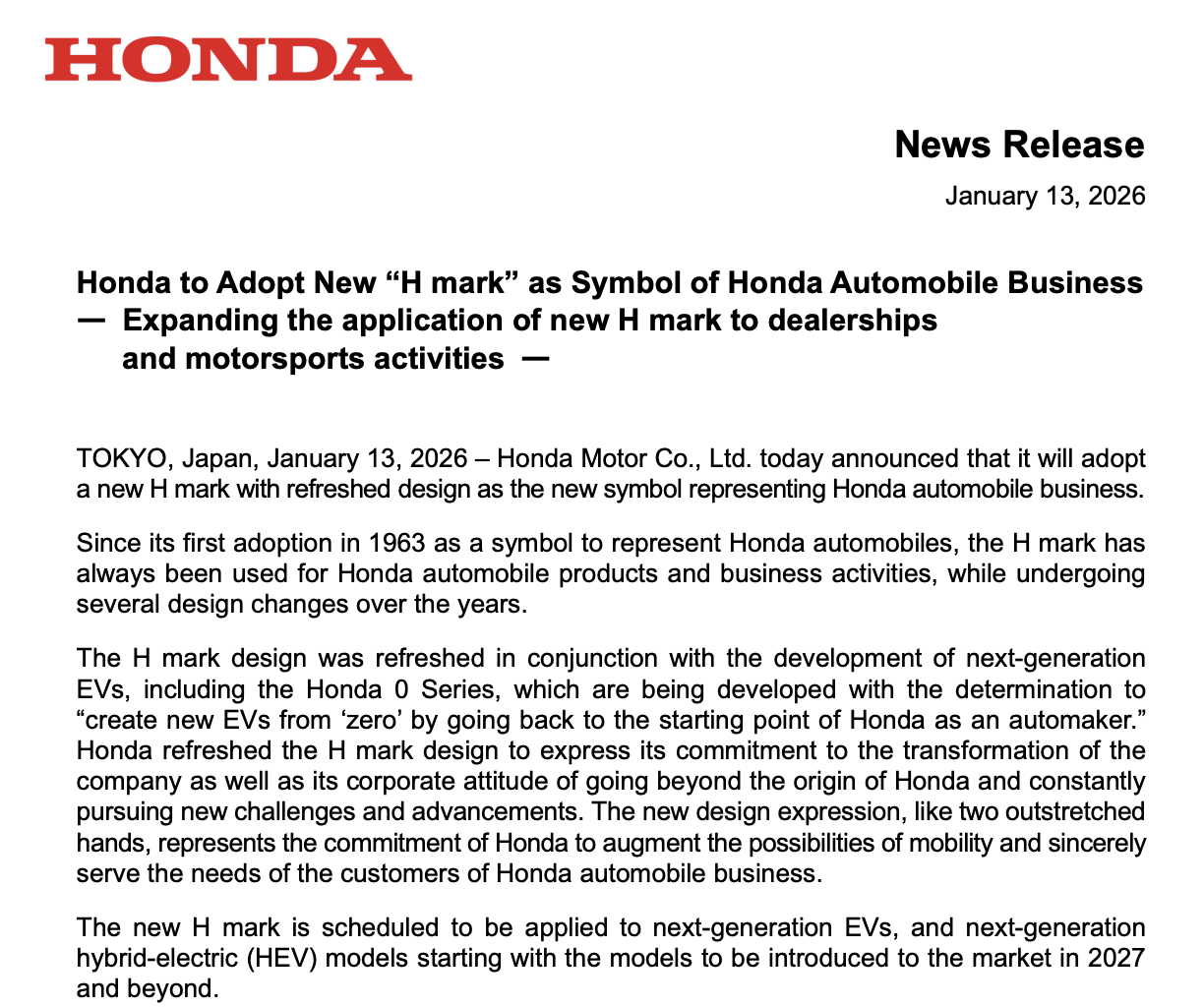 1月13日,本田汽车官宣,将采用全新设计的H标记作为代表本田汽车业务的新标志。据了解,新H标将于2027年起率先搭载于未来推出的纯电动汽车和混合动力汽车的车头与车尾,并将在旗下整车产品及全业务板块中逐