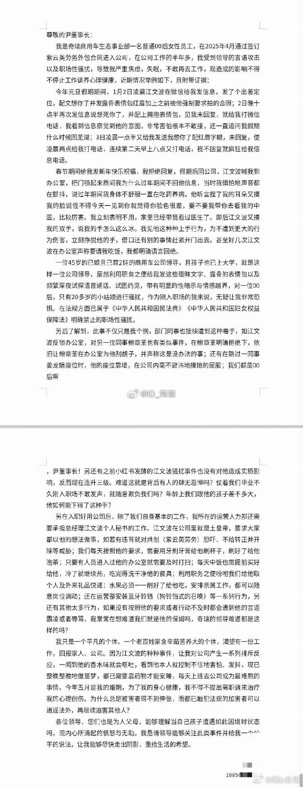 4月1日,一封实名举报信在网络社交平台迅速发酵,引发全网舆论高度关注。举报人为奇瑞商用车(安徽)有限公司一名00后女员工,她在举报信中实名指控公司管理人员江某某对其实施性骚扰,同时揭露江某某存在骚扰部