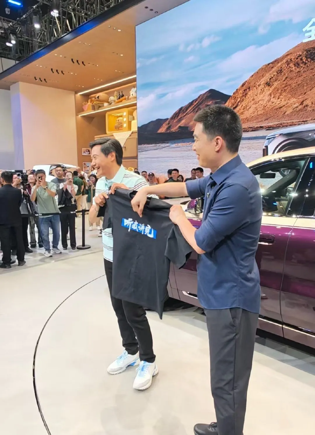 4月24日,在北京车展上,小米创始人雷军给部分同行车企送定制T恤,引发广大网友的关注。其中,雷军给理想汽车CEO李想带了件定制 T 恤,上面印着听我讲完 四个大字。雷军表示,“上次介绍理想L6,大家说