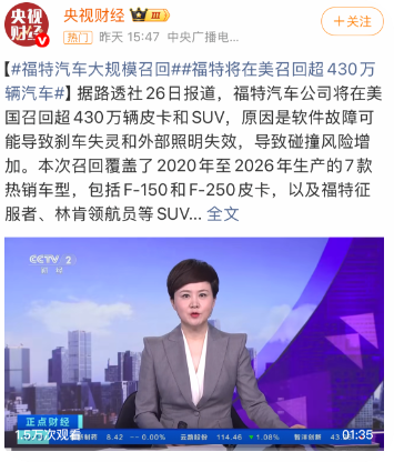据央视报道,近日因软件问题,福特汽车宣布将在美国召回430万辆皮卡和SUV。涉及召回的车型为生产日期在2021年至2026年款F-150、2022年至2026年款F-250 SD、林肯领航员、探险者、