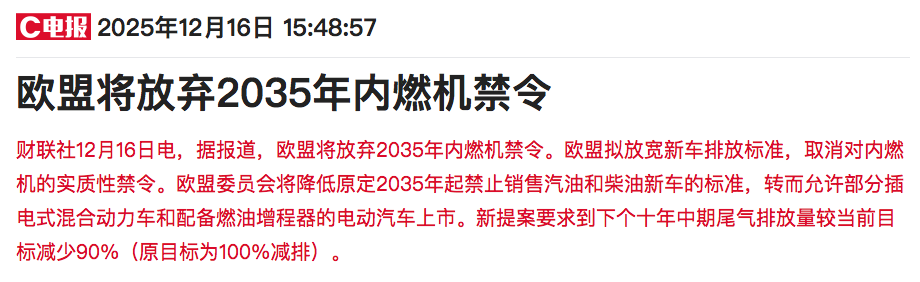 据多家媒体报道,当地时间12月16日,欧盟委员会公布一项提案,决定放弃原计划于2035年起全面禁售燃油新车的计划,取而代之的是允许部分插电式混合动力车和配备燃油增程器的电动汽车上市。新提案要求,与20