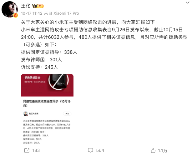 10月17日,小米集团公关部总经理王化在微博发文,公布小米车主受到网络攻击事件新进展。王化表示,小米车主遭网络攻击专项援助信息收集表自9月26日发布以来,截止10月15日24:00,共计6032人参与