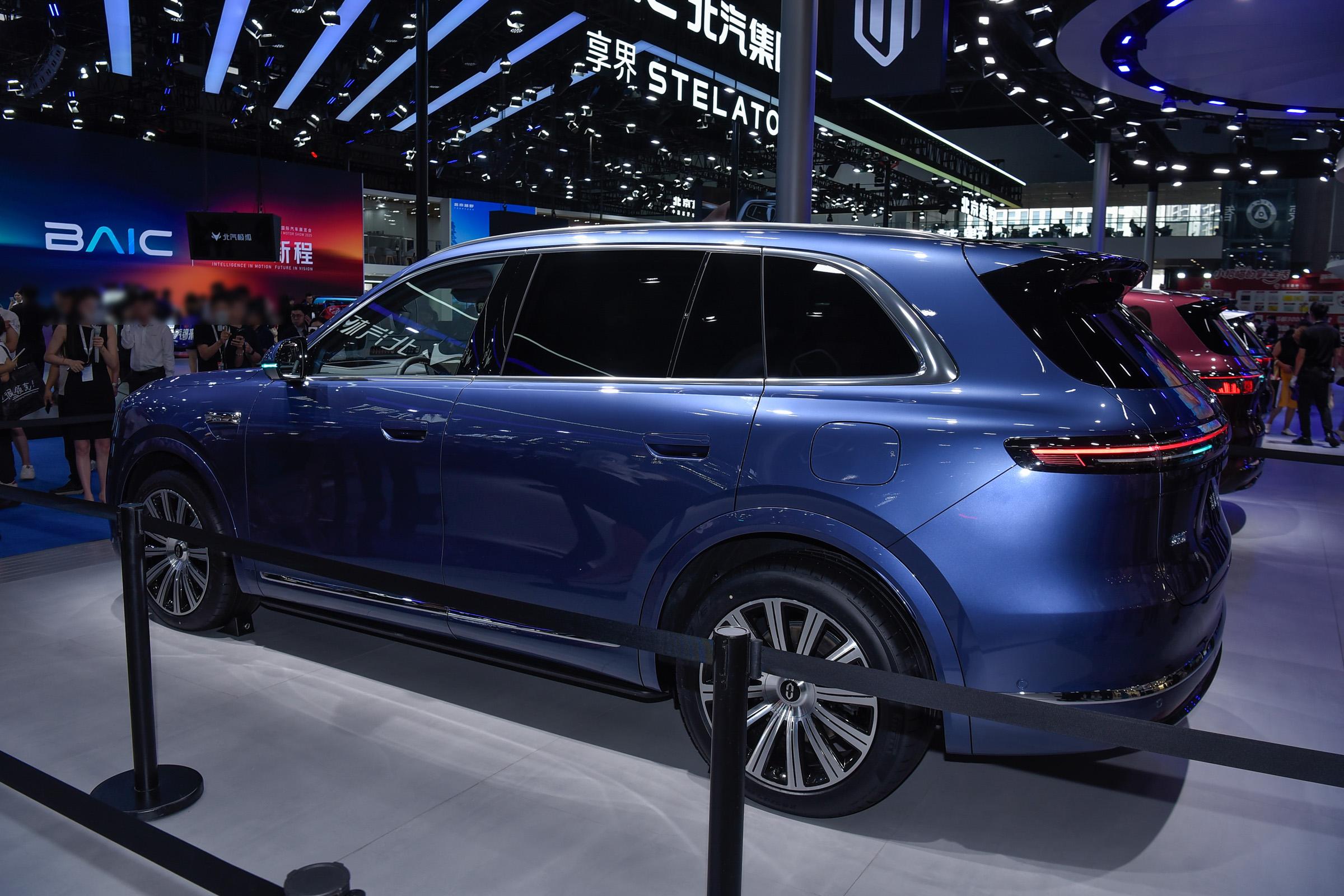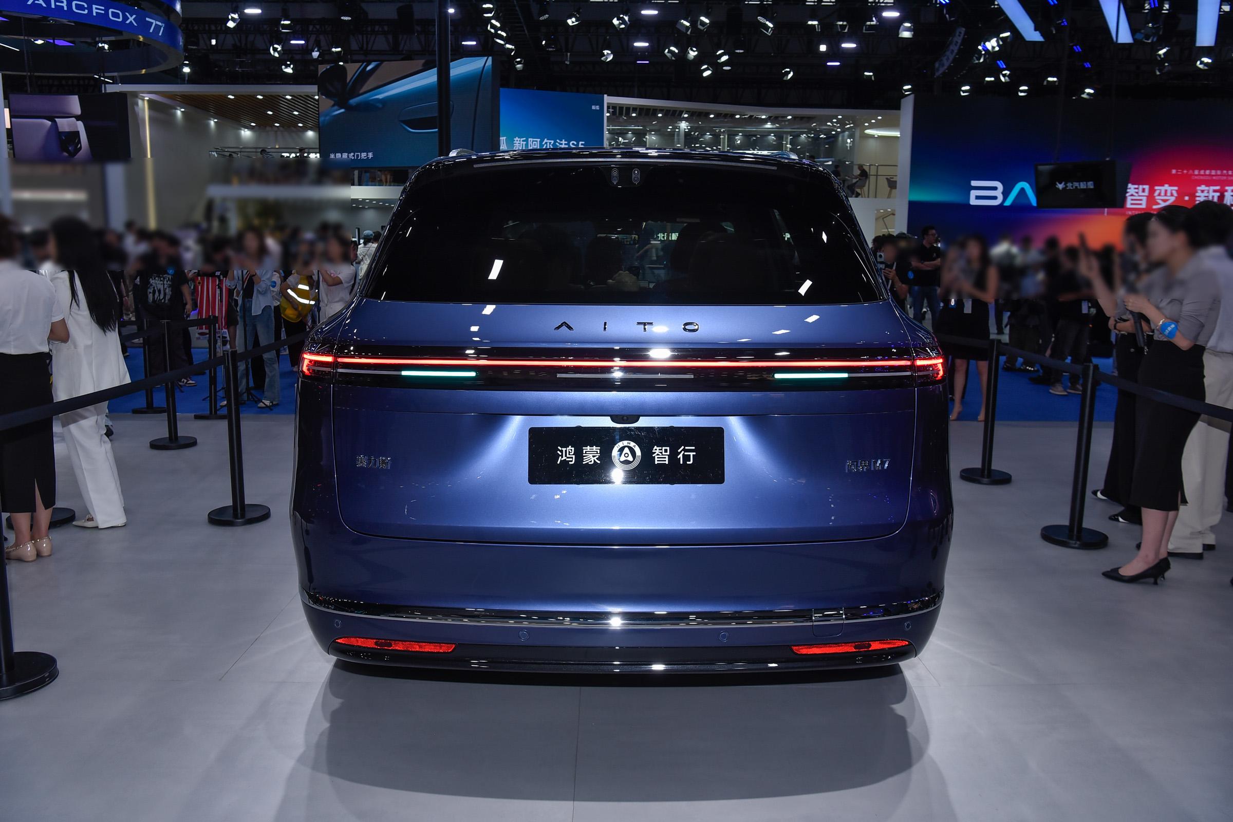 车身侧面,新车轮廓厚重,采用大量曲面,腰线贯穿车身,车顶线条则趋于平直,令车内空间更舒适。另外,新车还取消了全封闭式的隐藏把手,换装了半隐藏式门把手,并在车门下边缘加入一条镀铬装饰件,营造出动感的气息,同时新车还首次推出多幅式轮毂,豪华感同步增强。车身颜色方面,新车提供珊瑚红、海岛蓝、鎏金黑、暖云白、牧野青、星际蓝6款车色选择,并提供可选装黑曜套件,强化运动感。车尾部分,新车尾灯采用全新的贯穿式尾灯组设设计,且采用前倾式的后挡风玻璃,视觉层次感更丰富,尾灯上方带有“AITO”英文标识,进一步提升车辆的辨识度。后包围部分,新车增加了银色装饰件,视觉效果上更为精致。排气方面,新车增程版车型继续采用隐藏式排气布局,进一步营造车辆的运动属性。