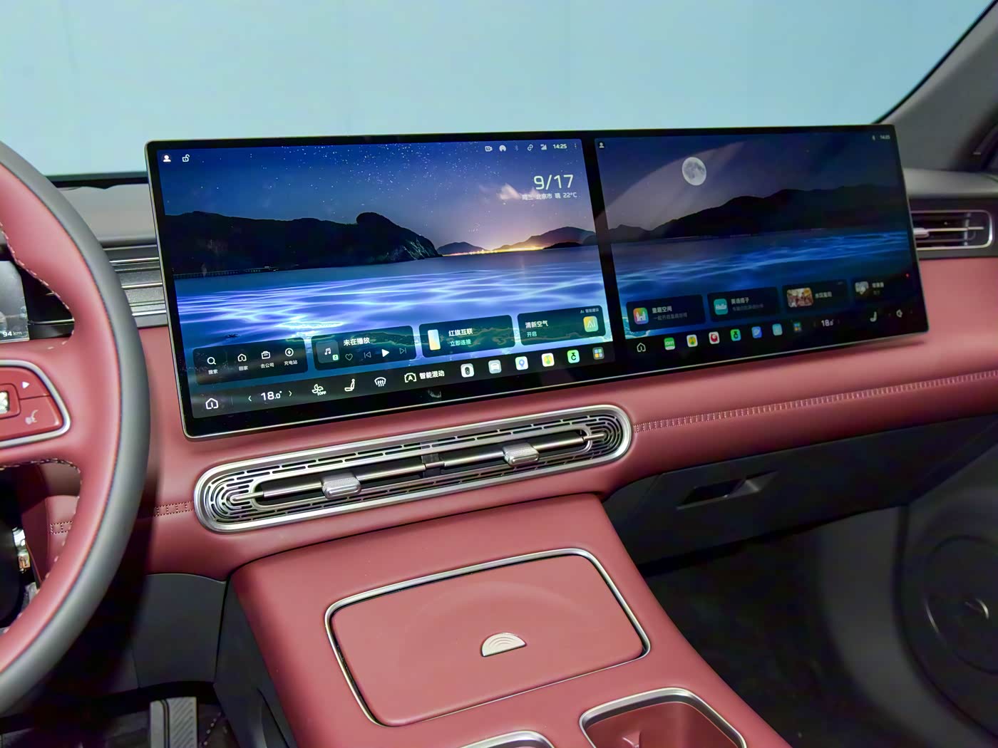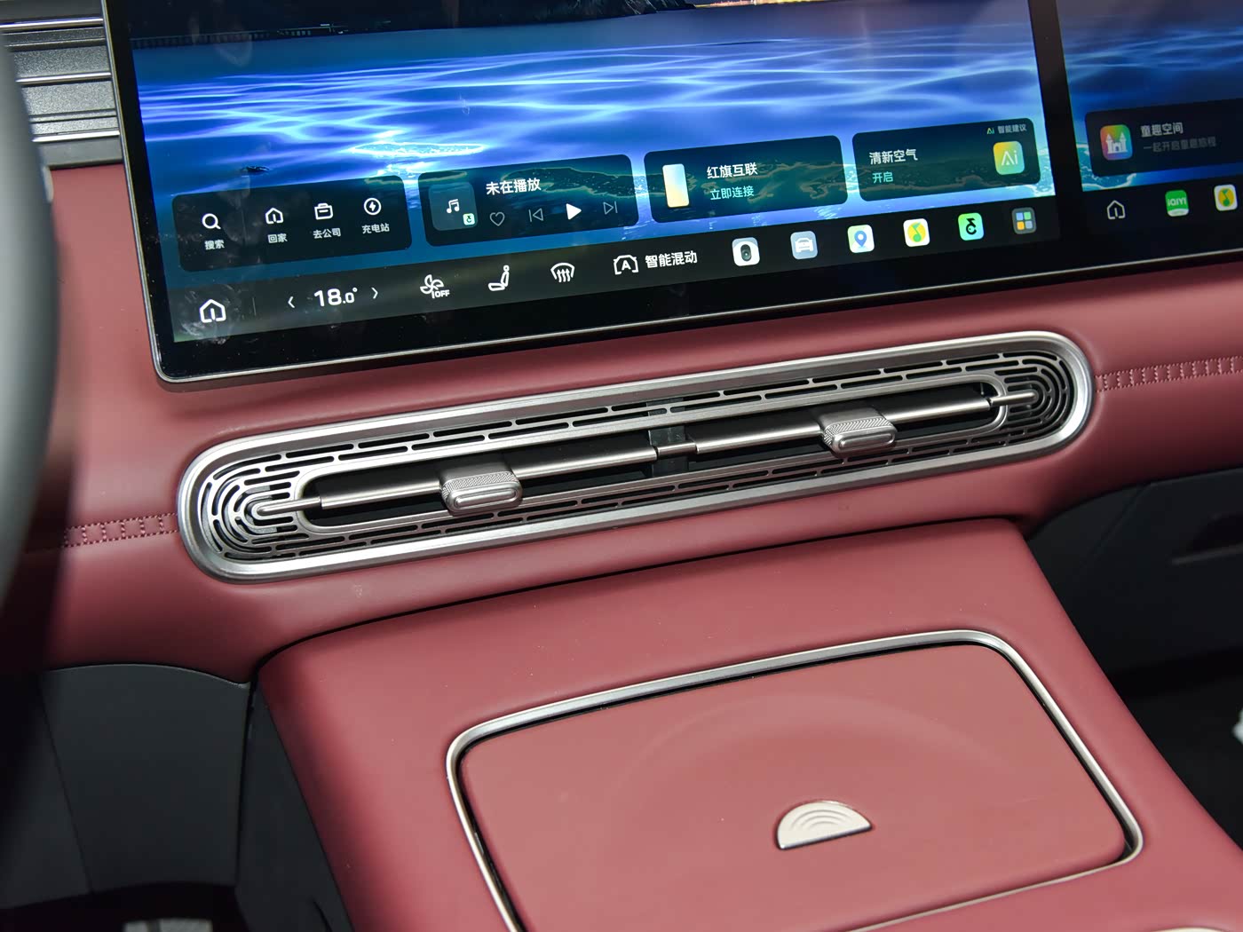 首先来看内饰,相比在售红旗新能源车型,红旗HS6 PHEV首次使用副驾双连屏设计,同步提供小尺寸液晶仪表盘和抬头显示系统。细节上,红旗HS6中控台为阶梯式设计,部分区域提供皮质包裹和缝线工艺,整体运用无实体按键的简约化风格,并在驾驶员侧设计有带盖板的小型储物槽。红旗HS6 PHEV采用三辐式造型和双拼皮质包裹,具有按压+滚轮的实体多功能按键。由于采用怀挡式设计,该车副仪表台区域可提供单手机无线充电板、双杯架和带有盖板的储物槽,副仪表台下部设计有掏空式储物空间。