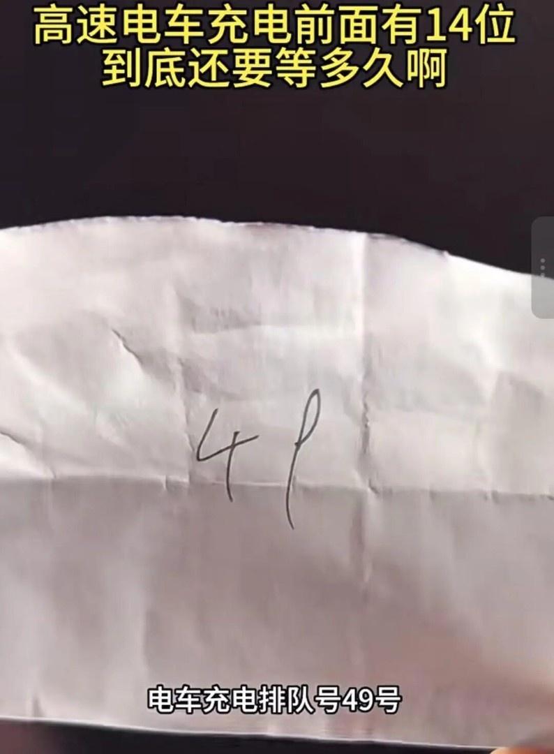 有车主在网络发布视频称,9月30日晚,自己的新能源汽车在湖南一高速服务区充电,该服务区充电有专人叫号。在该网友发布的视频中可以看到,车主拿到了一张手写号码为49号,其表示自己已排了1个多小时,前面还有14位。对于高速服务器开启叫号模式这一做法,有服务区工作人员告向媒体透露,国庆期间有专人在值守,指导新能源车排队充电,“一般只让充约半个小时,80%的电量”。