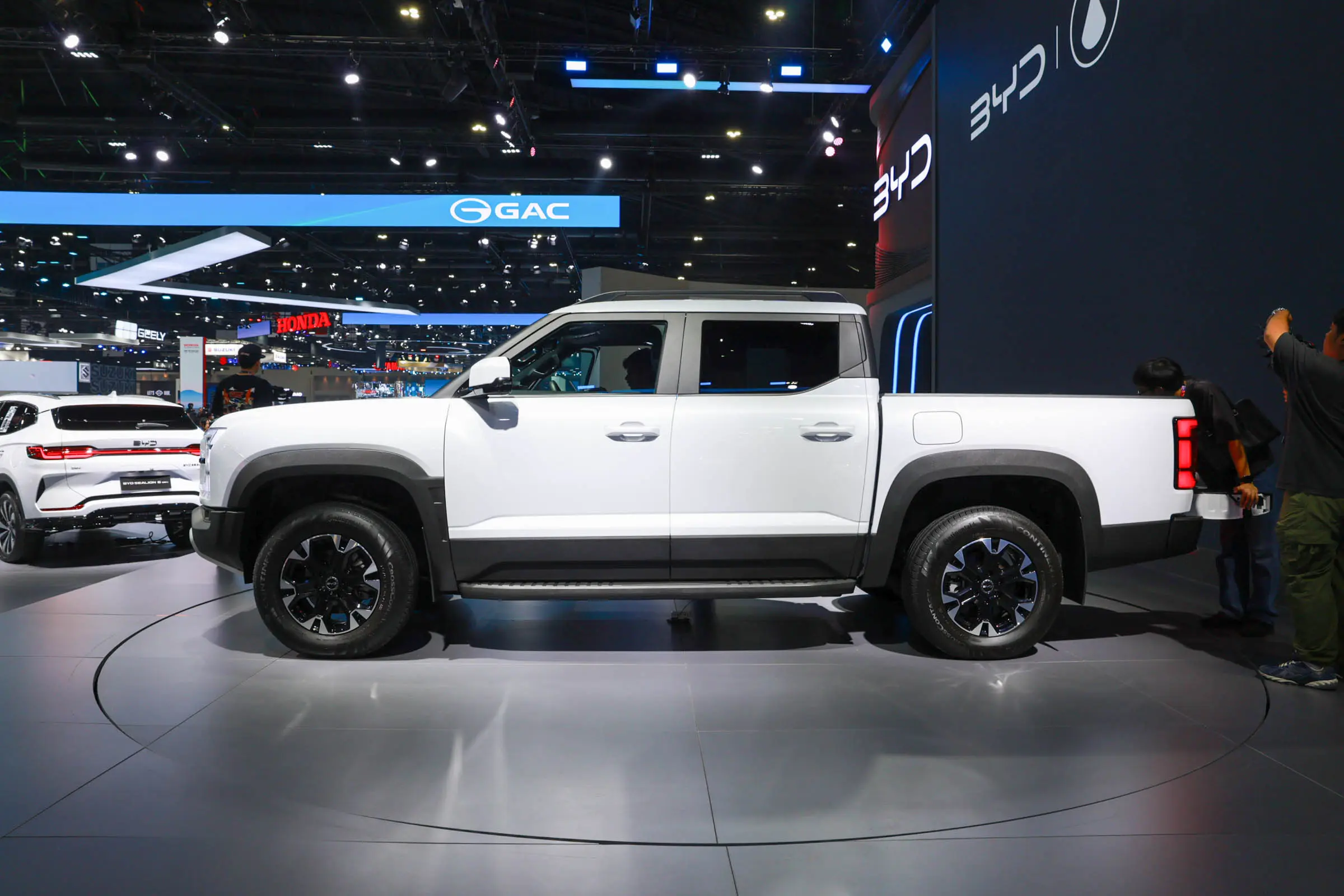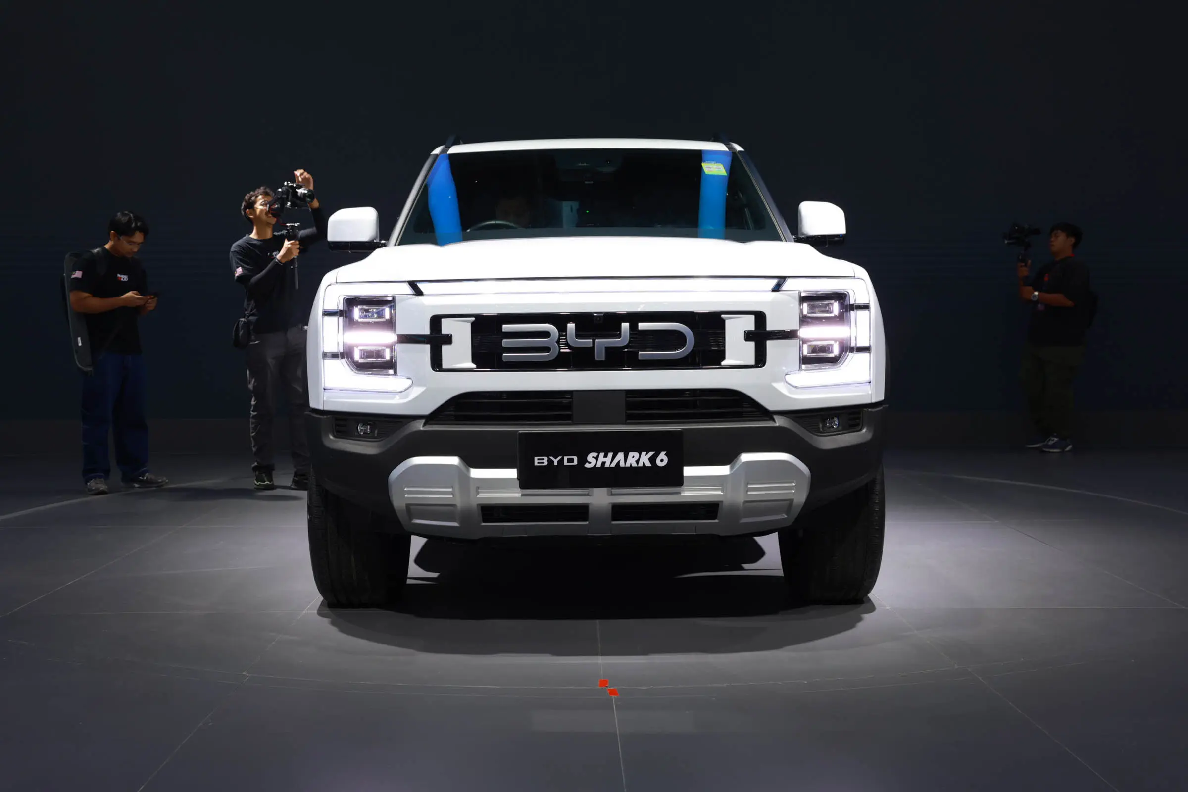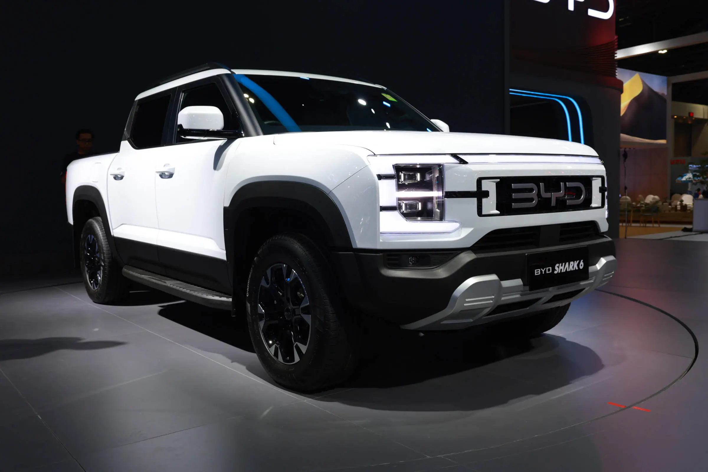 比亚迪SHARK采用前后双叉臂式独立悬架、非承载式车身结构、CTC电池底盘一体化技术以及虚拟差速锁,可提供沙地、泥地和雪地三种驾驶模式,拥有2500kg的牵引能力、835kg的载重能力并支持V2L外放电功能。补能方面,使用40kW快充可在20分钟内完成30%-80%的补能。