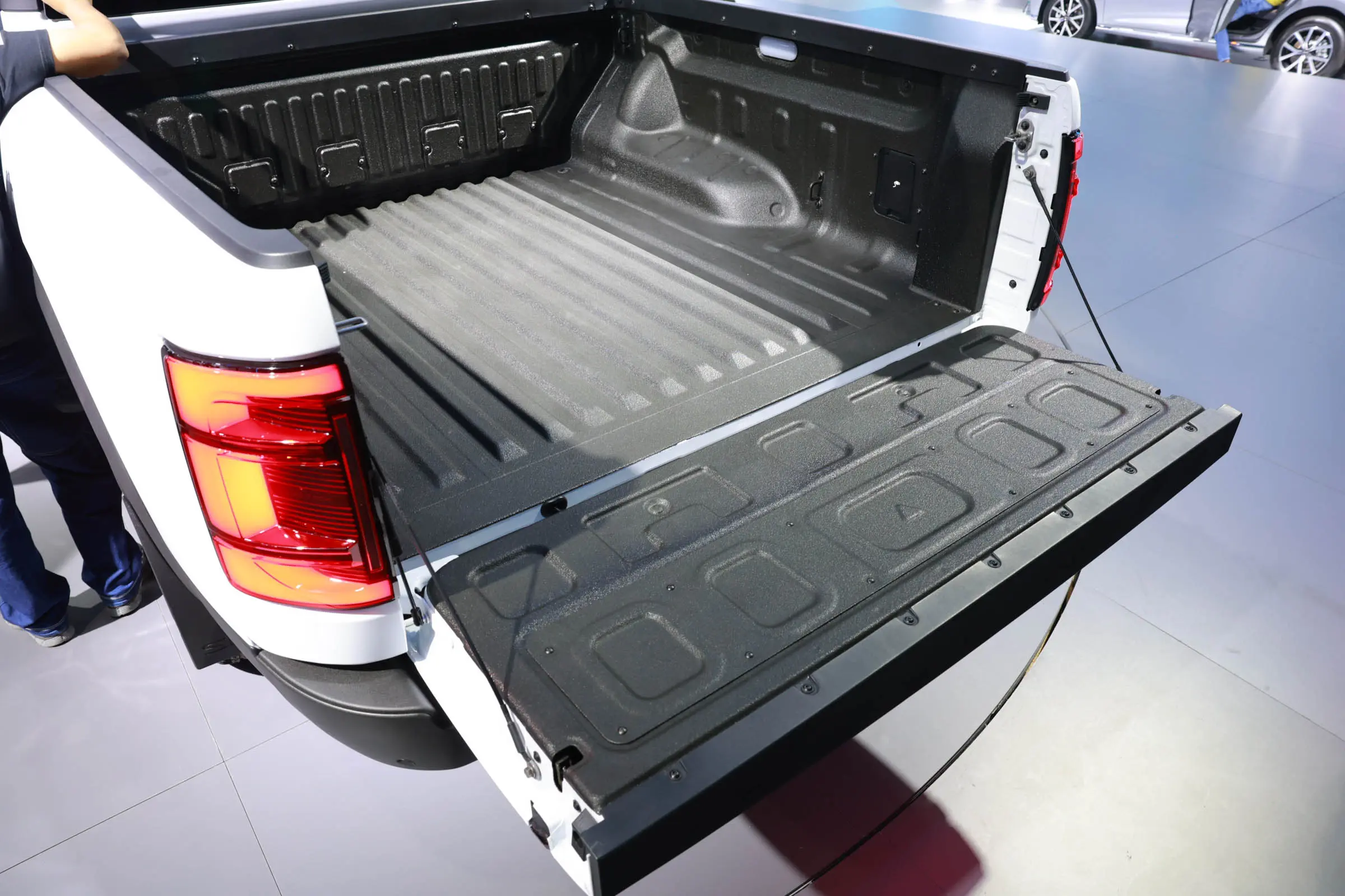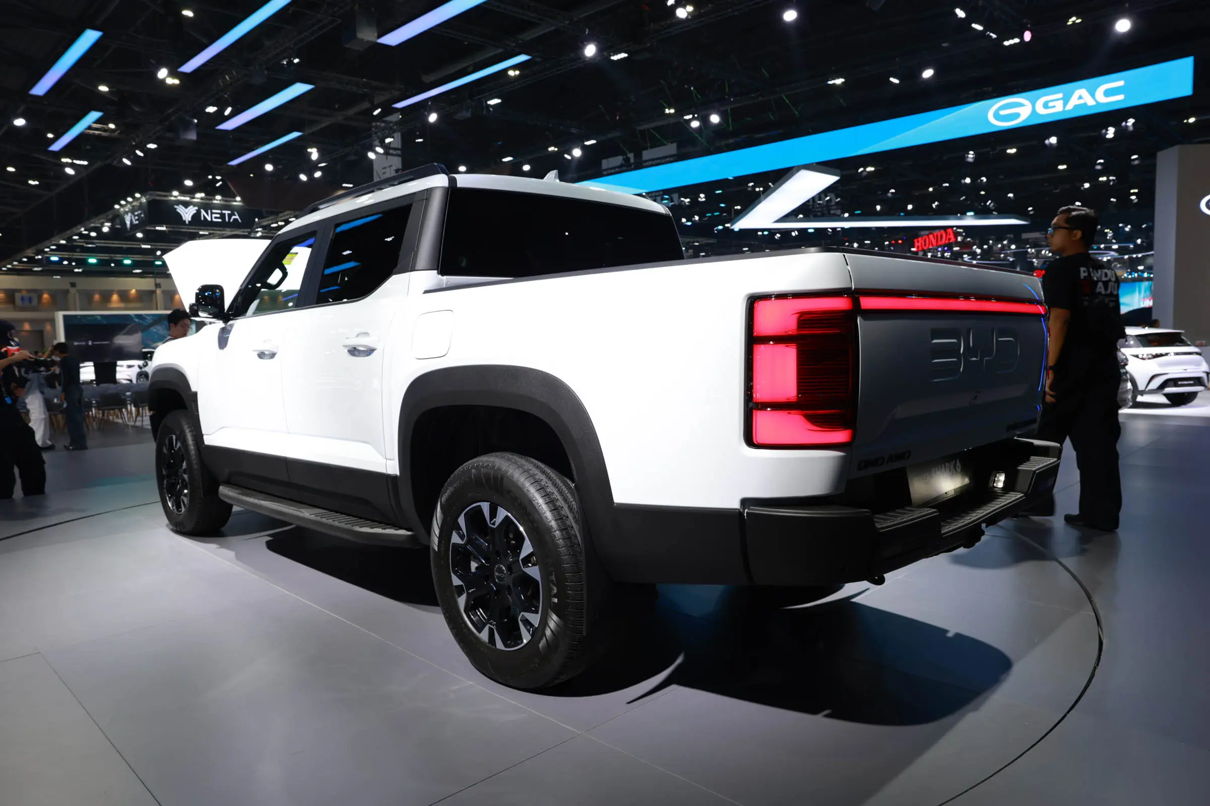 车尾方面,比亚迪SHARK同样配有大尺寸BYD品牌LOGO,配合竖状尾灯组以及贯穿式灯带,与车头形成呼应。尺寸方面,新车长宽高分别为5457/1971/1925mm,轴距为3260mm,拥有1450L的货箱容积,接近角和离去角分别为31°和19.3°,满载离地间隙为210mm。