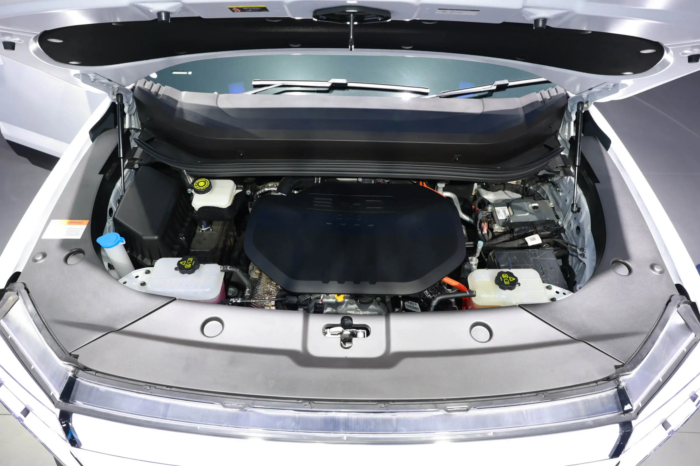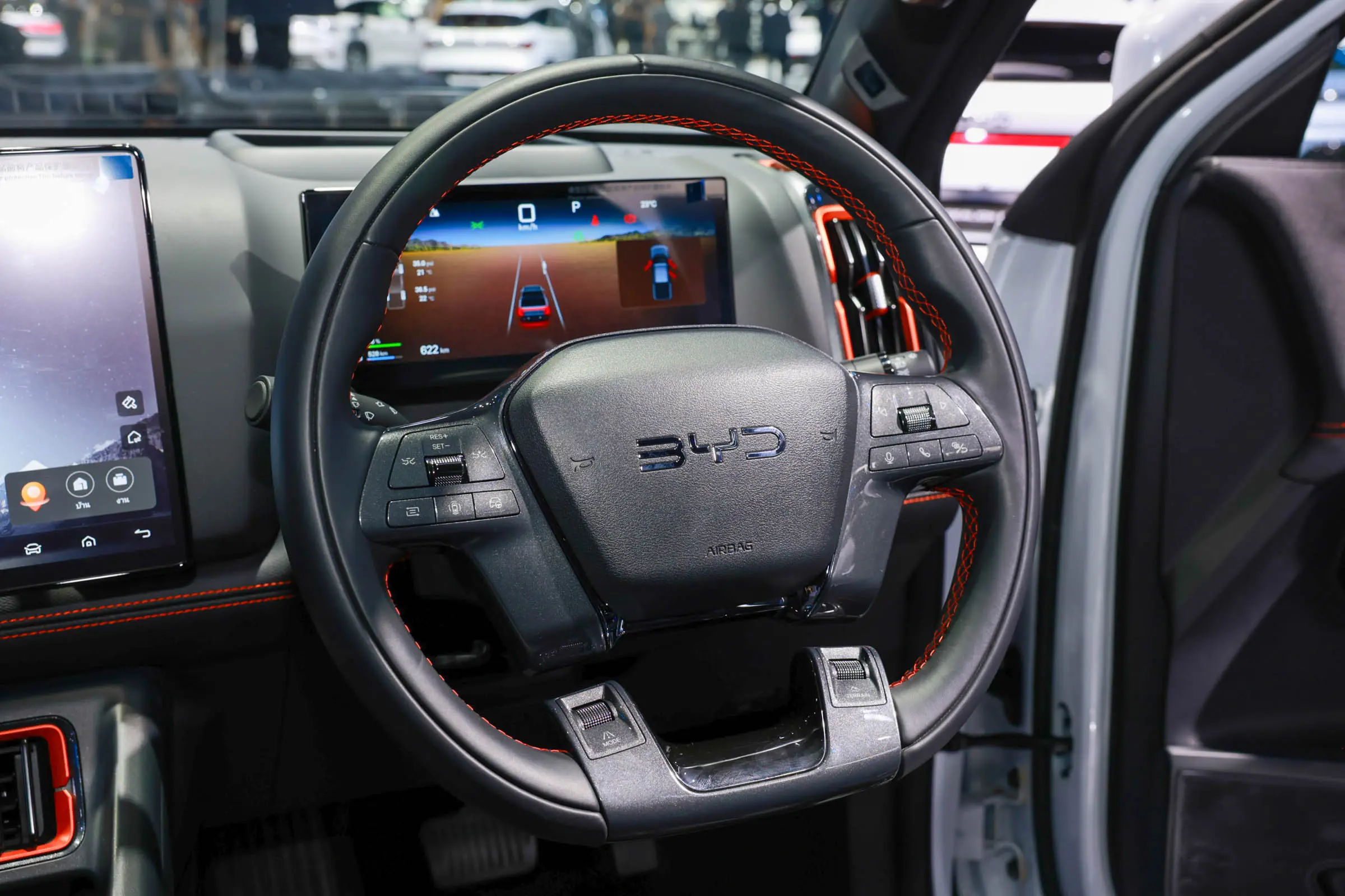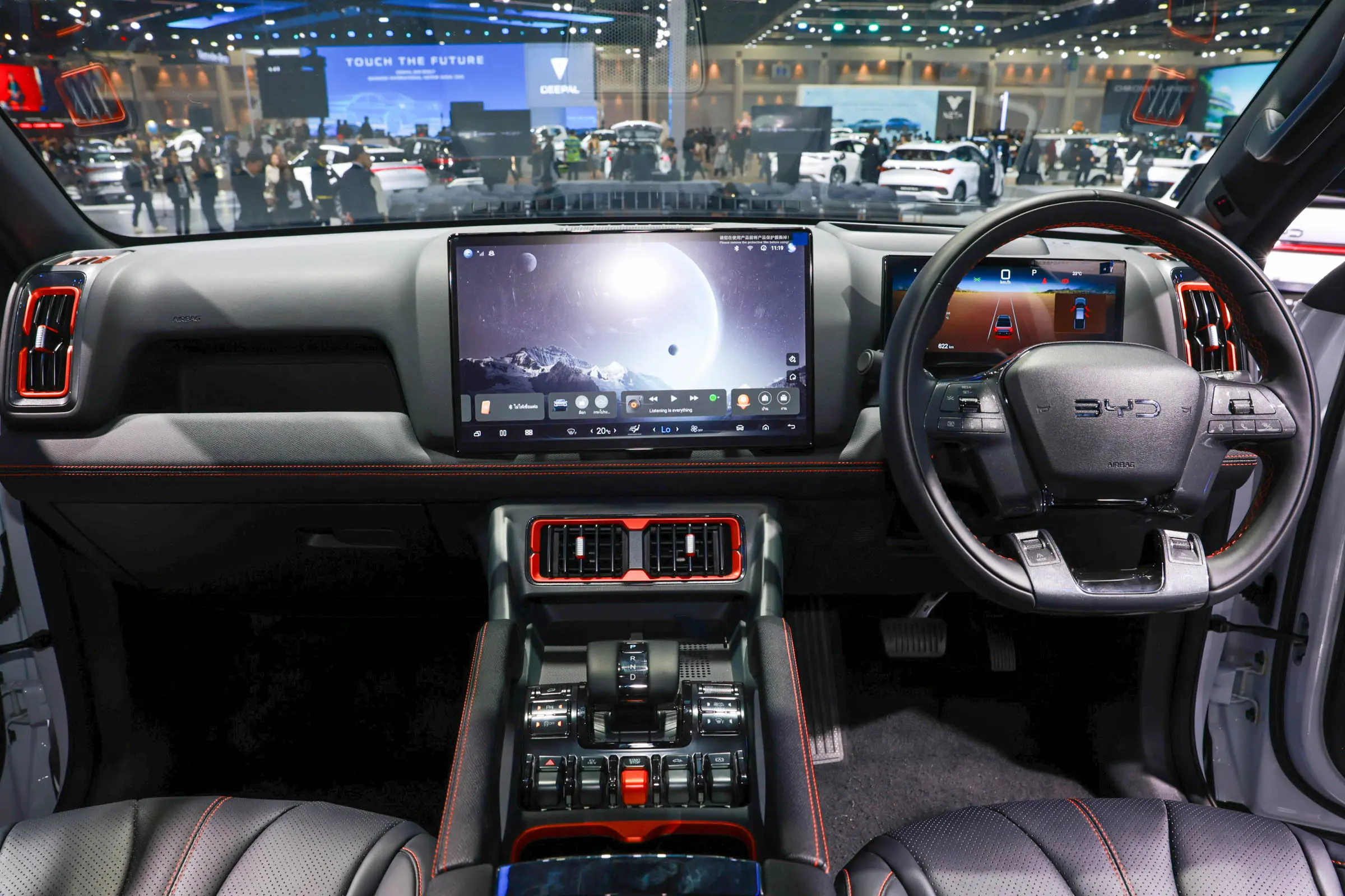 内饰方面,比亚迪SHARK采用类似于方程豹豹5的设计风格,保留比亚迪经典的可旋转式12.8英寸中控屏,全新样式的四辐式方向盘前方配备10.25英寸液晶仪表,另外还提供12英寸W-HUD抬头显示屏,空调出风口以及车内缝线加入橙色元素,副仪表台区域与豹5保持一致,前方提供最大功率50瓦的手机无线充电面板,同时可支持Apple CarPlay/Andriod Auto手机互联。