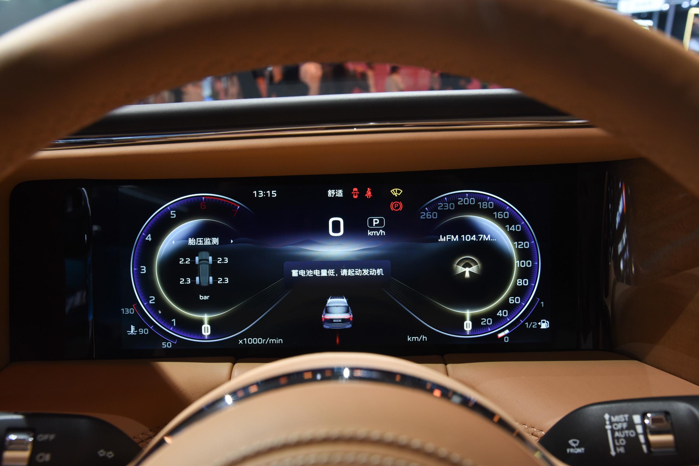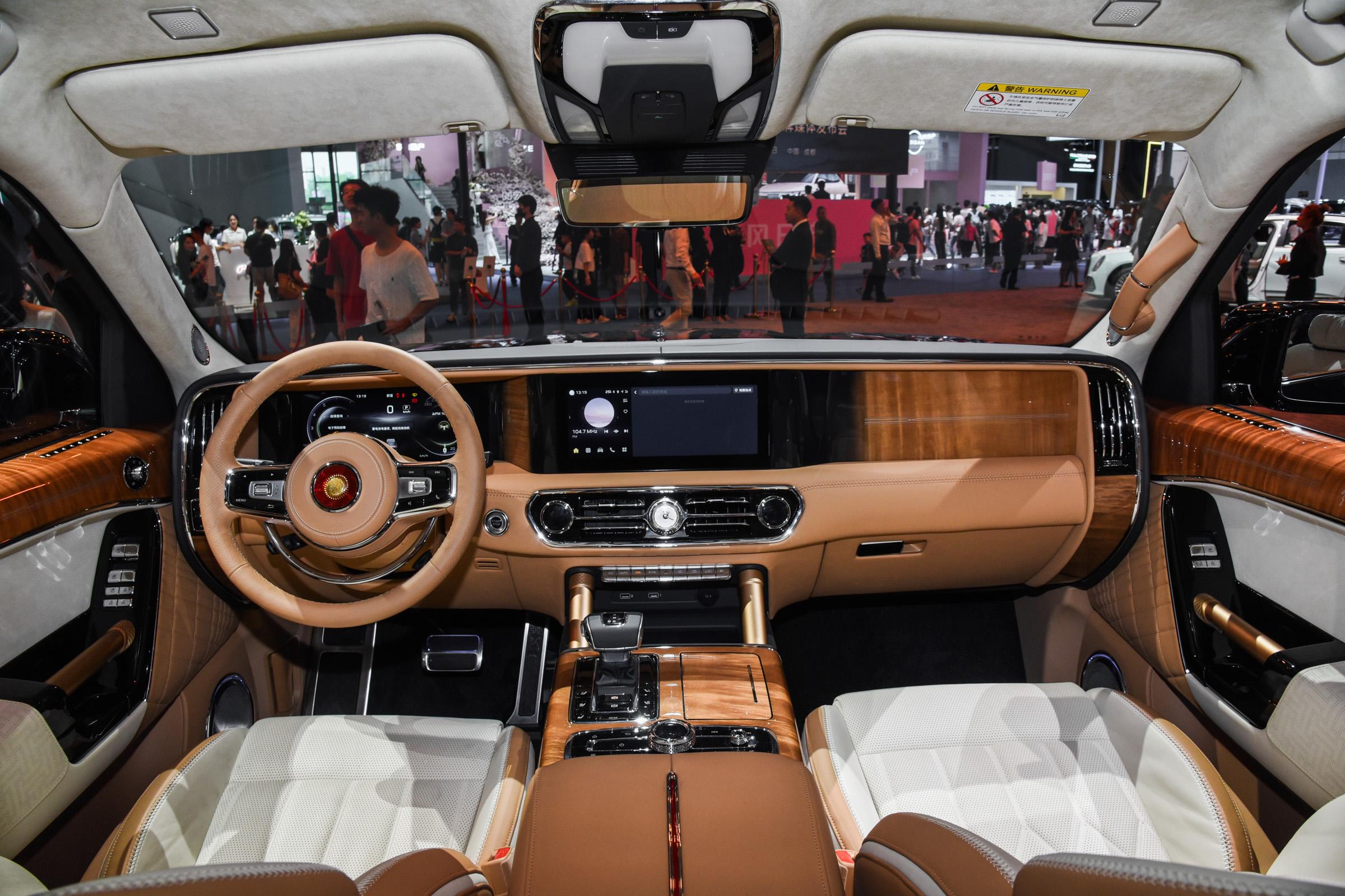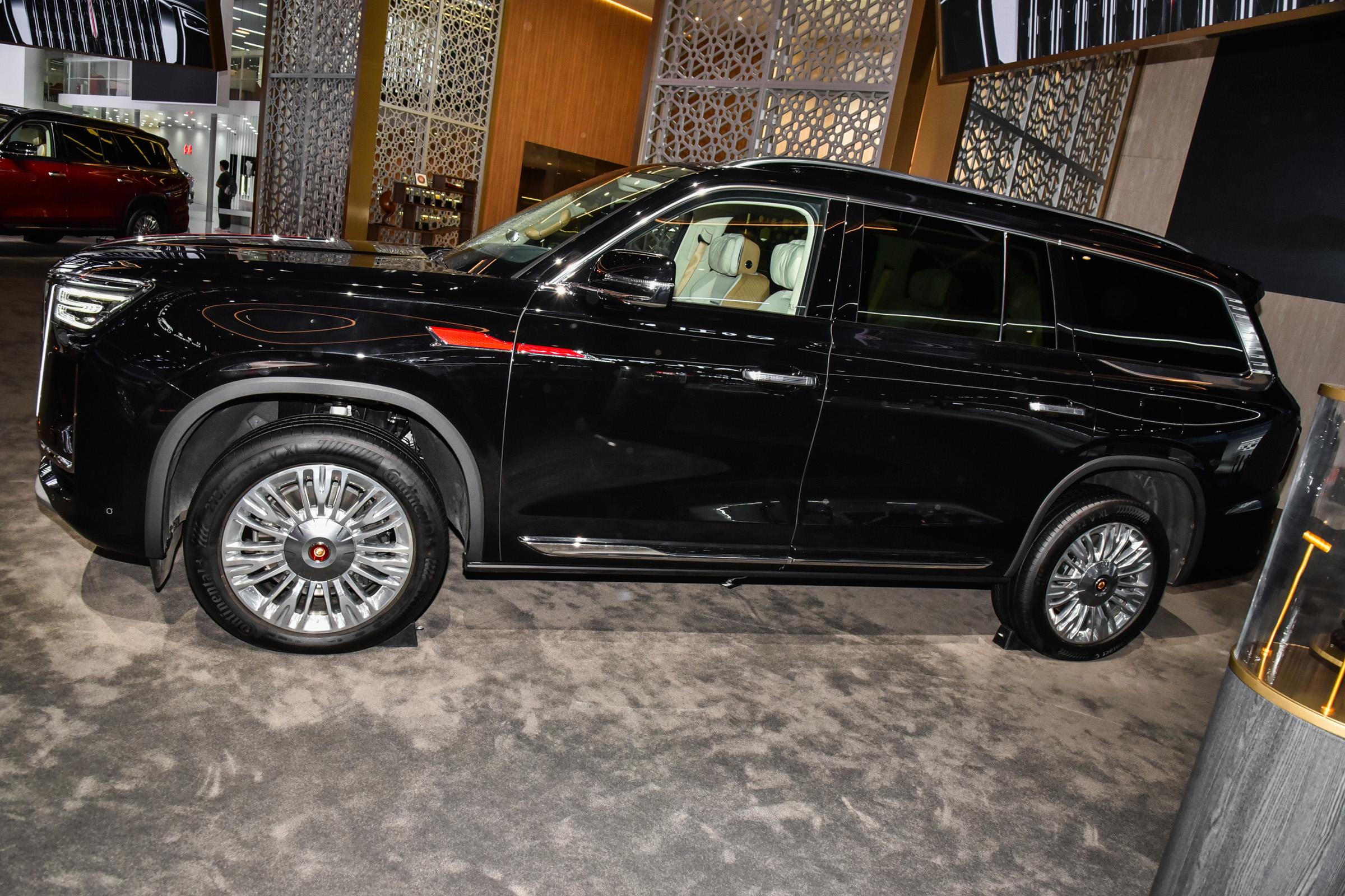 车身侧面,新车线条流畅平直,看起来十分魁梧。新车提供双色车身和双色腰线设计,车顶与车身形成鲜明的撞色对比,搭配22英寸密条辐镀铬轮辋等设计,彰显出大气蓬勃的气势。车身颜色方面,新车标配22英寸密条辐镀铬轮辋和丹砂黑车身配色,并提供装极地天马和白玉兰两个主题款。尺寸方面,新车长宽高分别为5695/2095/2010mm,轴距为3309mm。对比2022款车型,新车车身高度增加了25mm,其它尺寸则保持一致。车尾部分,新车采用当下流行的贯穿式尾灯组,内嵌多颗LED光源,夜晚点亮后有着不俗的显示效果。后包围部分,新车同样采用钛合金蜂窝结构,展现车辆的质感。排气方面,新车采用双边四出排气口造型,实际排气管路隐藏于底盘下方。