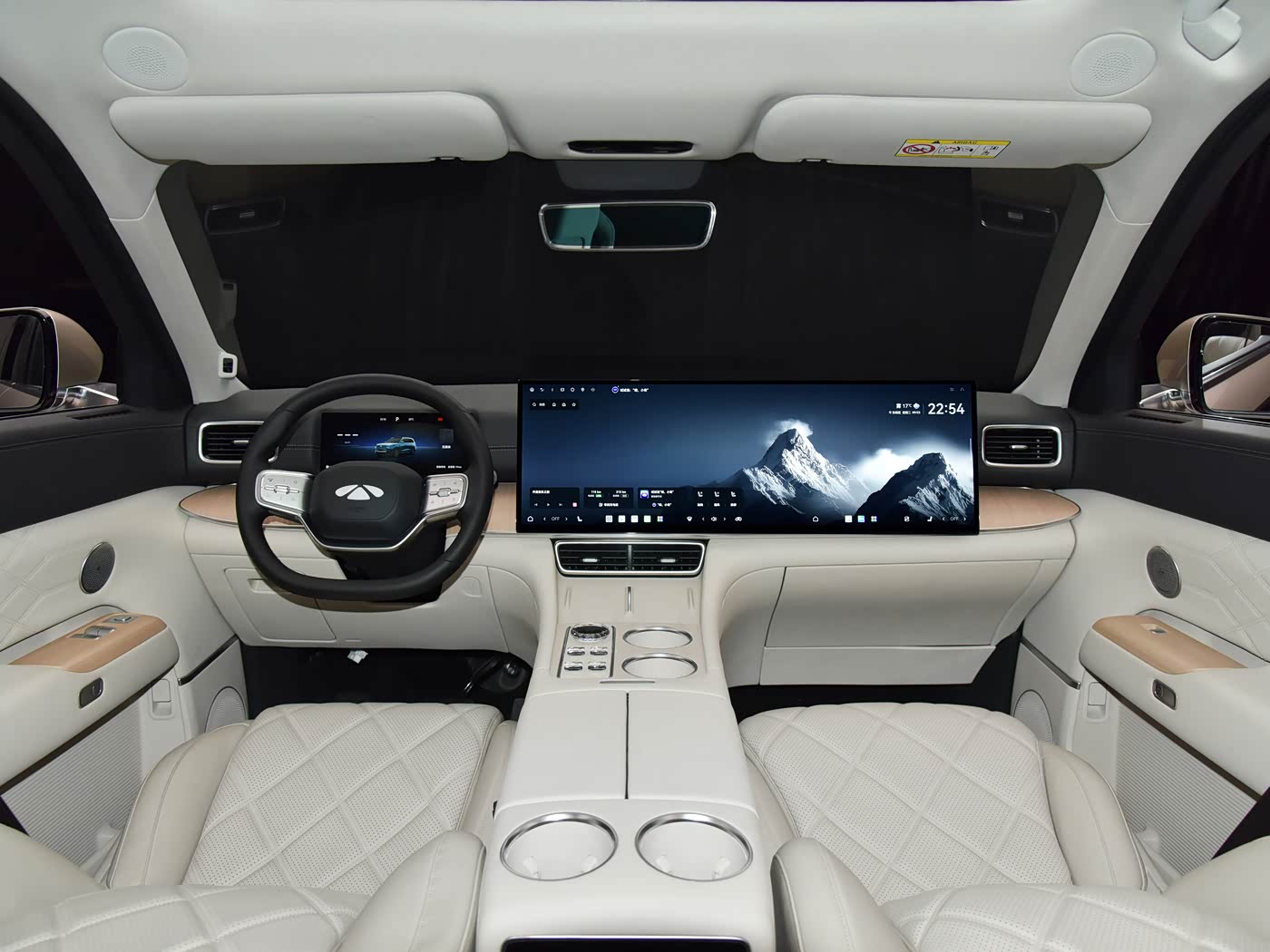 内饰部分,新车车内布局简洁,配备小尺寸内嵌式全液晶仪表盘,搭配AR-HUD抬头显示系统,中控台上配备30英寸贯通式6K多媒体触控屏,方便用户更好的操作。另外,新车还配备双辐式多功能方向盘、电子怀挡机构,256色全车氛围灯、三种香氛以及23扬声器,整体科技感十足。辅助驾驶方面,新车标配猎鹰500辅助驾驶系统,高配车型搭载猎鹰700辅助驾驶系统。座椅布局方面,新车采用2+2+2式的6座空间布局,座椅采用大面积皮质材质包裹,提升车辆高级感和舒适感。