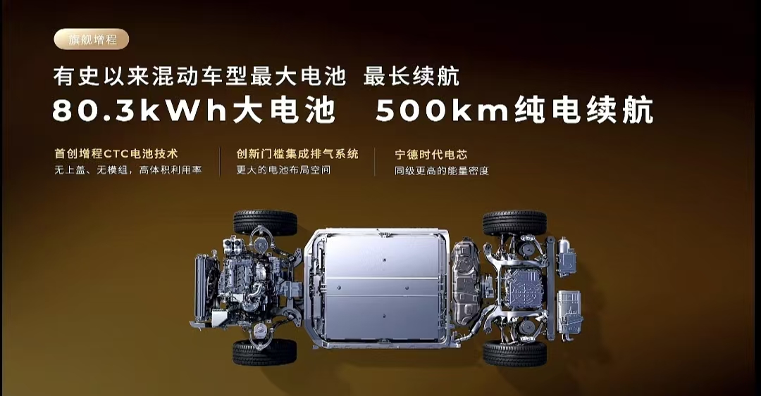 动力方面,新车提供增程和纯电版两种动力。其中,增程版车型采用800伏CTC增程技术及智能增程四驱,系统综合功率为400千瓦,匹配配备80.2kWh的电池组,纯电续航里程超500公里;纯电版车型基于1000V高压平台技术打造,配备115kWh电池组,最大续航里程为720公里。