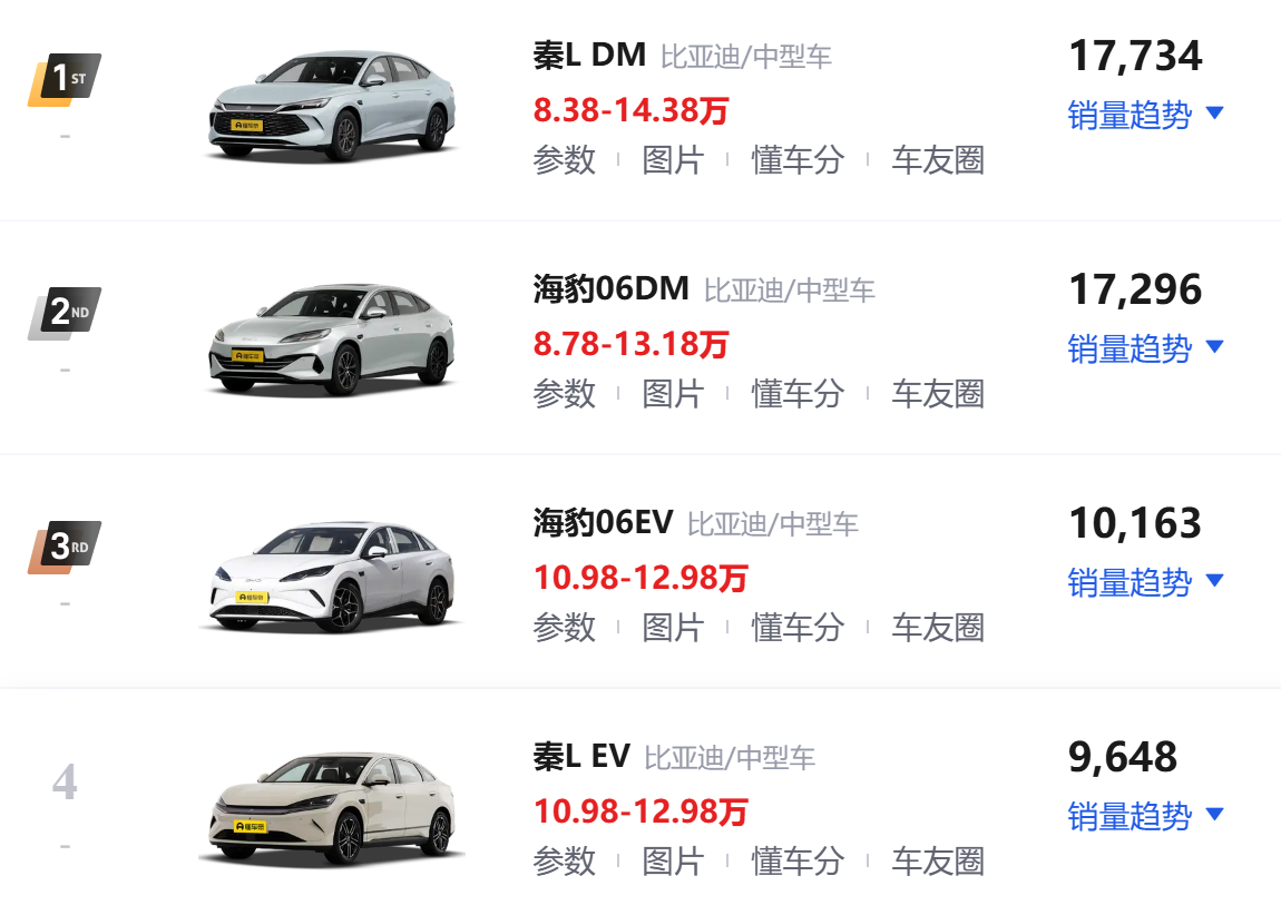 9月比亚迪旗下海豹06以27459辆的销量位列榜首位置,取代了秦L,后者销量为27382辆。不过将时间拉长到今年前9月累计销量来看,秦L依然位列榜首位置,累计销量为212202辆;海豹06为169179辆。简单来说,今年前9月中型轿车榜单前两名依然是比亚迪秦L和海豹06两款车型。