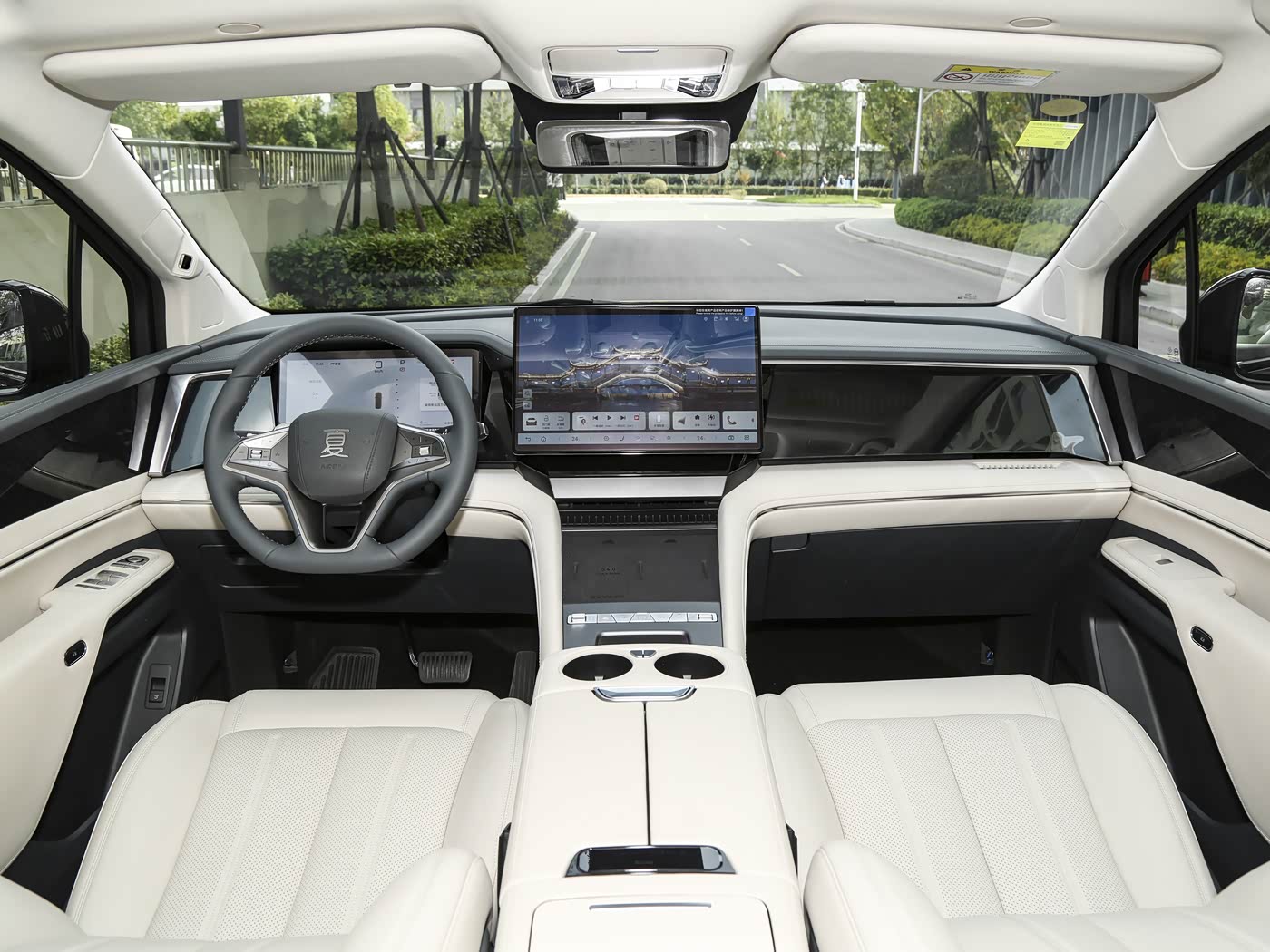 座椅方面,新车座椅头枕有所优化,回归传统样式,座椅采用2+2+3的布局,前排提供加热、通风、记忆、按摩功能,并提供头枕音响。二排两个独立座椅宽大舒适,同样提供了加热、通风、记忆、按摩和头枕音响,还提供腿托和小桌板,二排与三排还有独立的顶部空调出风口,第三排座椅也支持电动调节,并能一键折叠。后备厢容积为470L,拓展后达2036L。前后分段式天窗,前部可电动开启,顶配车型后排还提供了15.6英寸娱乐屏,高配车型配备车载冷暖箱,根据配置的不同,全车配备12或24扬声器杜比全景声DiSound音响,最高选装28扬声器,并支持便携可拆卸户外音箱。
