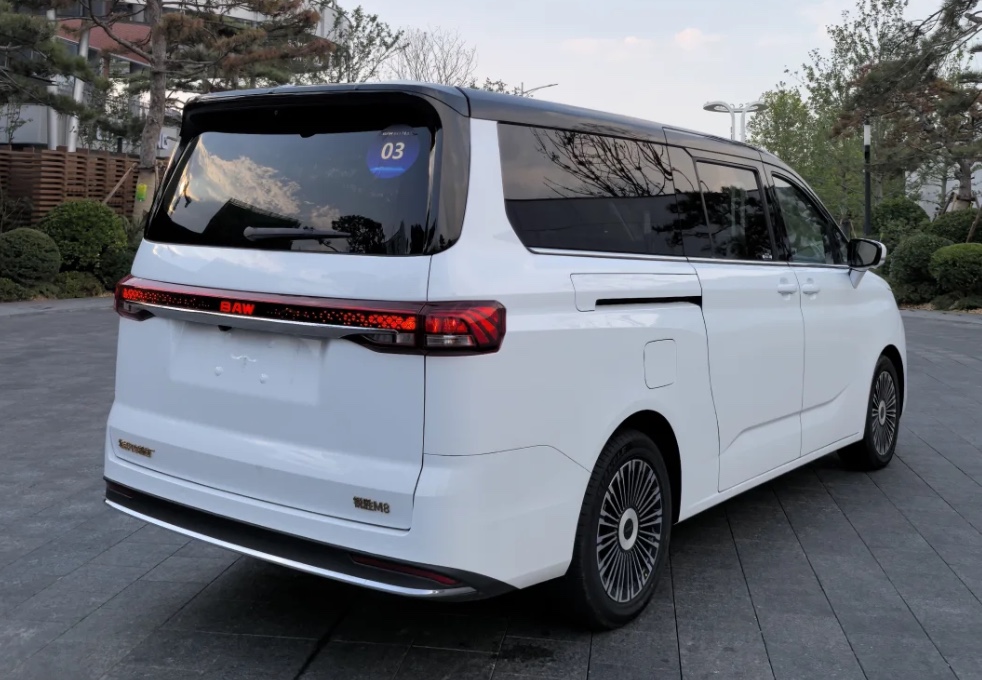 车身侧面,新车整体造型非常修长,车身采用高强度笼式结构,配备双侧侧滑门。尺寸方面,新车长宽高分别为5317/1870/1955mm,轴距为3200mm,定位中大型MPV,提供7座和9座两种座椅布局。作为参考,锐胜王牌M7长宽高分别为5240/1870/1950mm,轴距为3200mm。相比之下,新车长度和高度均有小幅增加,宽度和轴距则保持一致。车尾部分,新车整体造型看起来方方正正,尾灯采用贯穿式灯组设计,并加入了一根银色的镀铬饰条,提升尾部造型的精致度,“BAM”品牌标识也融入在灯组中央,夜间点亮极具辨识度。另外,新车还采用整体上掀式尾门布局,并可提供可选装电动侧滑门。排气方面,新车燃油版车型和增程版车型均采用隐藏式排气布局。
